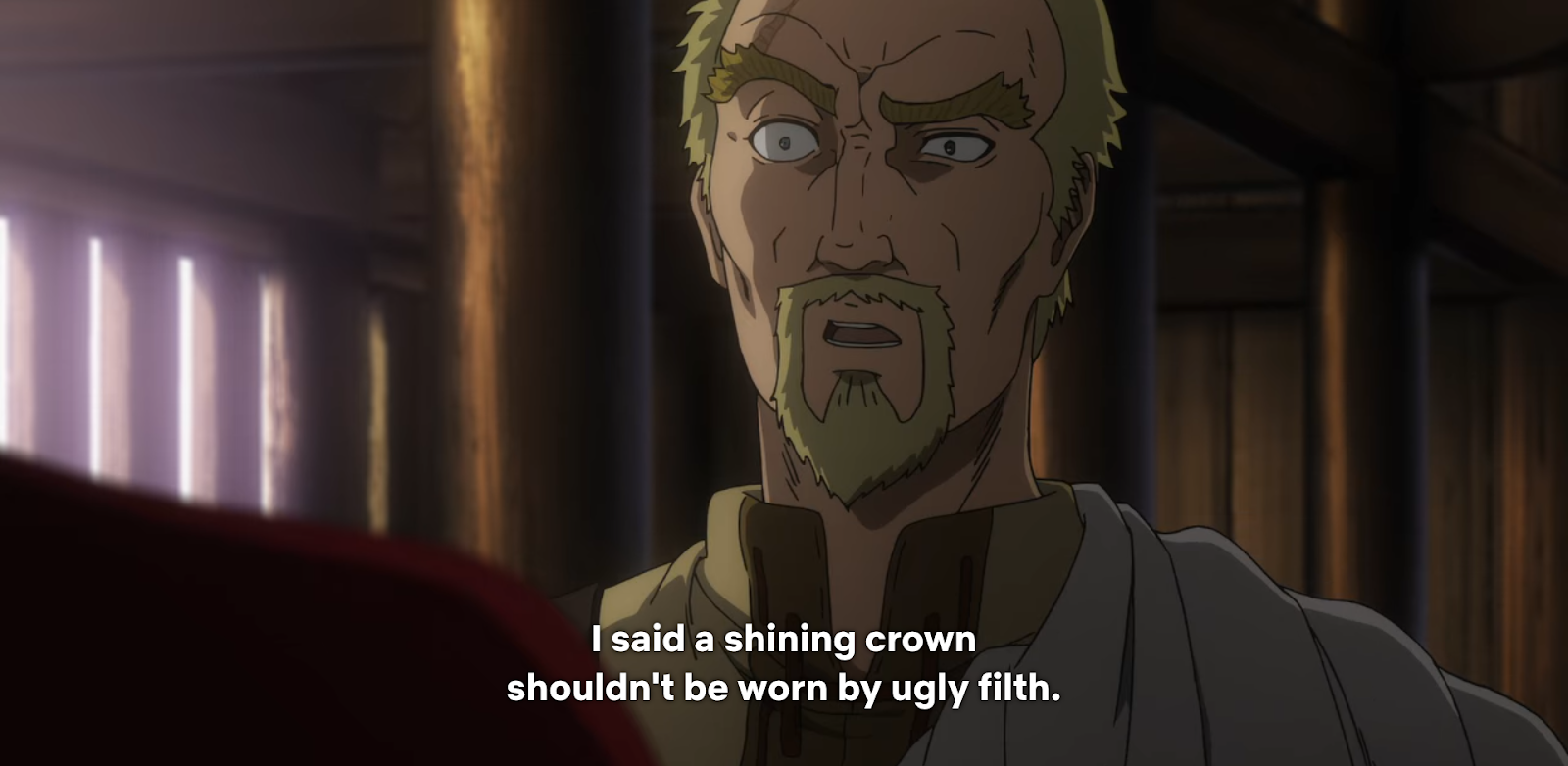 Then, a series of actions builds up to a climax. First, the king asks Askeladd to kill Canute, then Askeladd reverses the power balance, going from being submissive to threatening, and then the king orders his men to kill Askeladd.