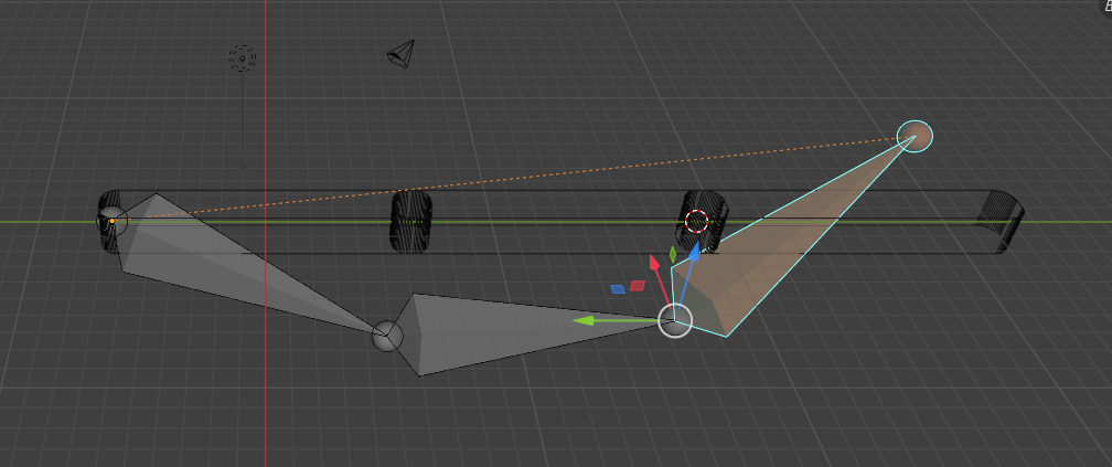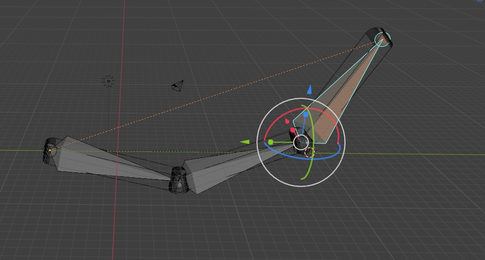 - Give each segment a small default rotation to observe how forward kinematics behave. When you rotate the base (parent) object, the children follow thanks to the parenting chain.