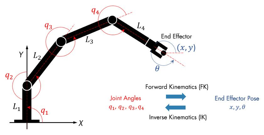 Kinematics is the study of how things move in space without worrying about the forces that cause the motion. In animation, it means focusing on how a character or object’s joints, limbs, and body parts transform from one pose to the next, rather than worrying about muscles or gravity pulling them.