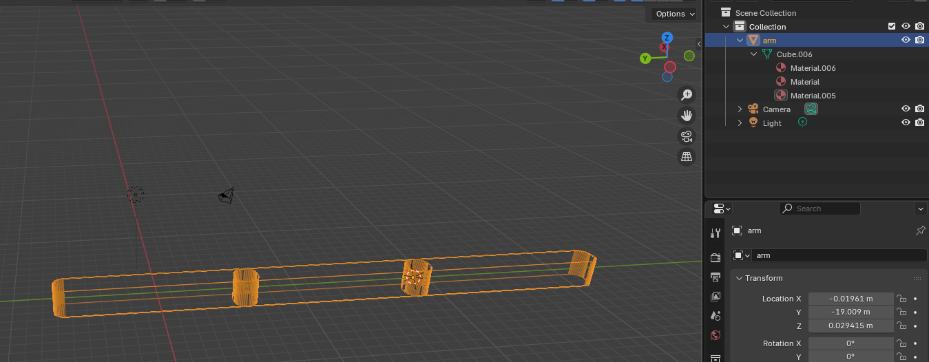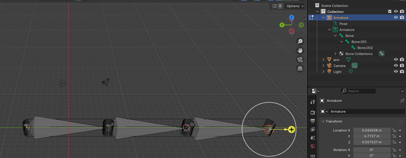 Add → Armature. In the Armature’s Edit Mode, extrude bones to match the segments. Select the tip of the first bone to extrude and place it at the elbow. Extrude again for the "hand".