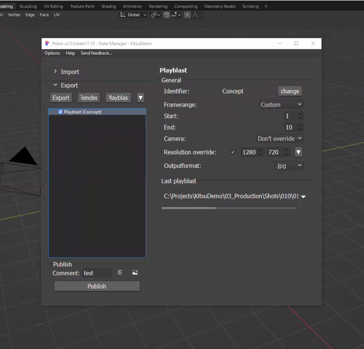 Once done, with a few clicks, you can generate a playblast for your review session. With the integration, Prism can create comments and publish the result into Kitsu by creating a new review revision.