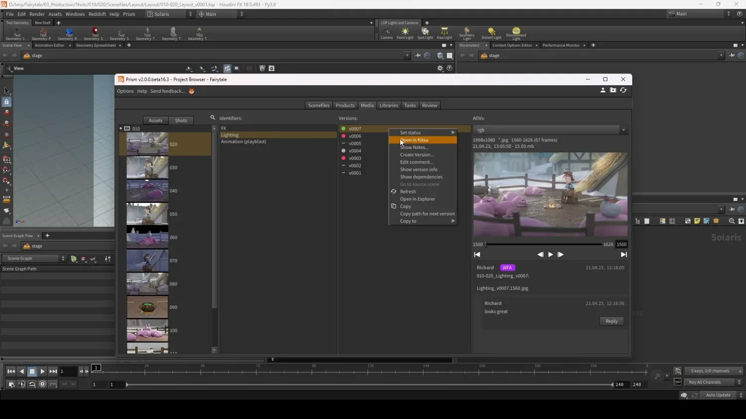 Prism offers you the framework to build and store your assets. From the Kitsu data, it will be able to organize all your files properly. When a scene is ready, Prism can push the playblasts generated from the scene into Kitsu. The Director will be able to perform reviews into Kitsu (or RV) and send the feedback right to the artist. Your asset lifecycle is under control.