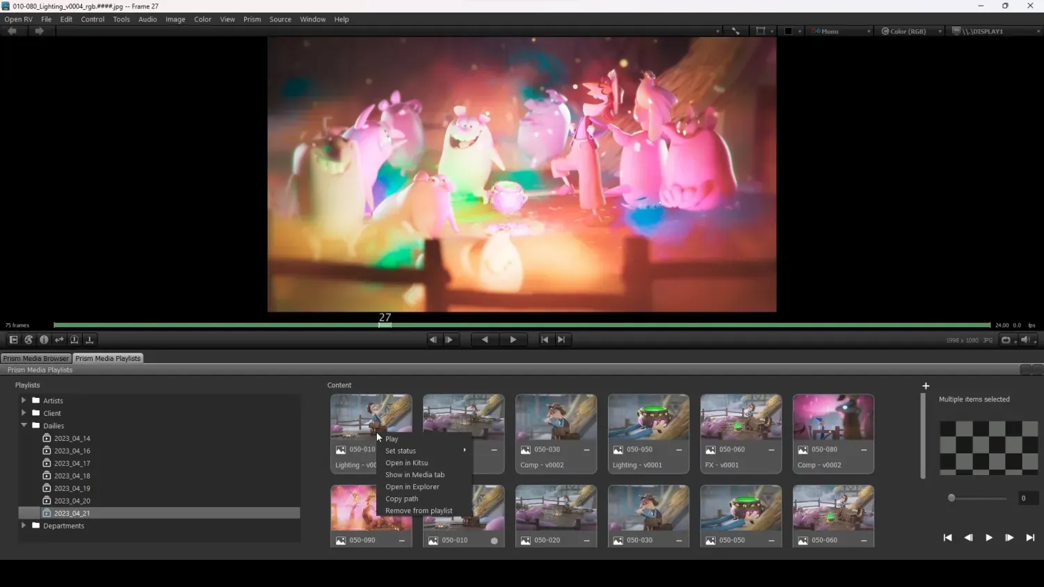 Last but not least, Directors can plug RV into the Kitsu playlists. Once the playlist is prepared into Kitsu, it can be downloaded to RV via Prism. All comments written in RV are sent to Kitsu and, that way, pushed to artists' Prism installations.
